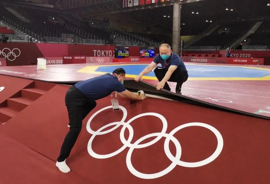 2021年7月20日,日本武道馆——奥运会柔道比赛场地。PG(中国大陆)-电子游戏东京奥运会服务保障团队正在布置、安装柔道器材。