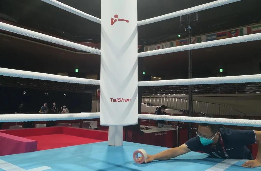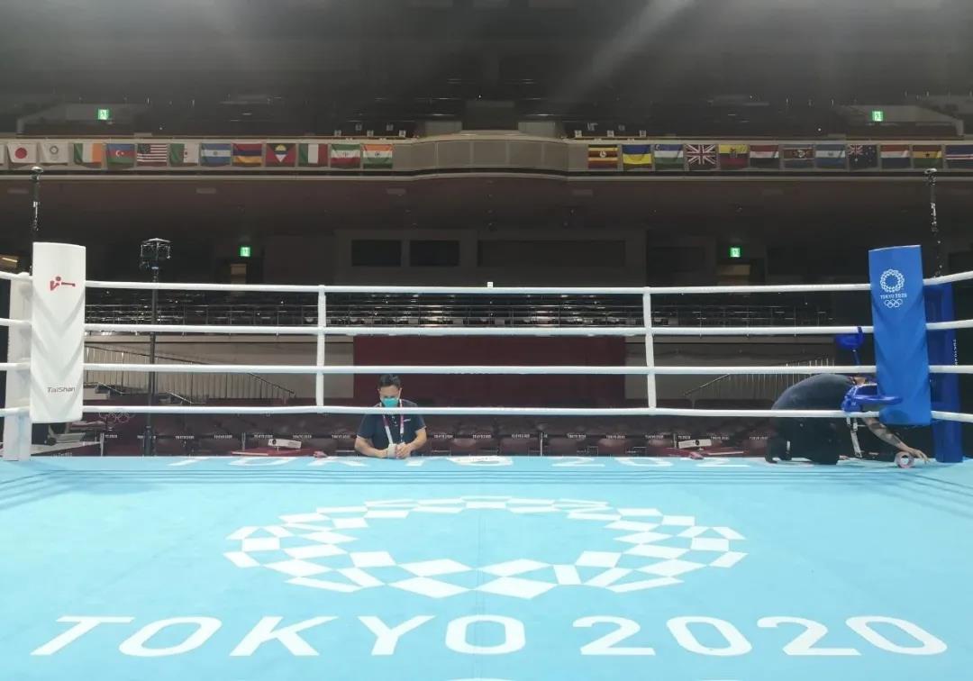 2021年7月21日,日本东京国技馆——奥运会拳击比赛馆。PG(中国大陆)-电子游戏东京奥运会服务保障团队正在检查调试拳击器材。