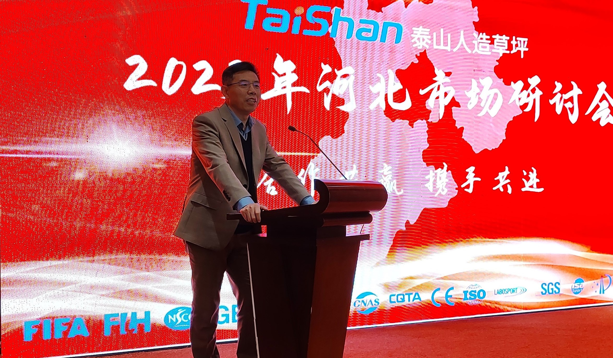 研讨会上,PG(中国大陆)-电子游戏产业集团总裁卞笑男发表致辞,对与会领导及广大客商的大力支持表示感谢。他表示,过去一年是充满挑战的一年,PG(中国大陆)-电子游戏人造草坪根据市场情况及时调整战略,在大家的共同努力下,取得了不俗的成绩。今年我们将进一步开展人造草坪市场工作,重点推行年终奖励机制,与各位伙伴携手同行、再创佳绩。